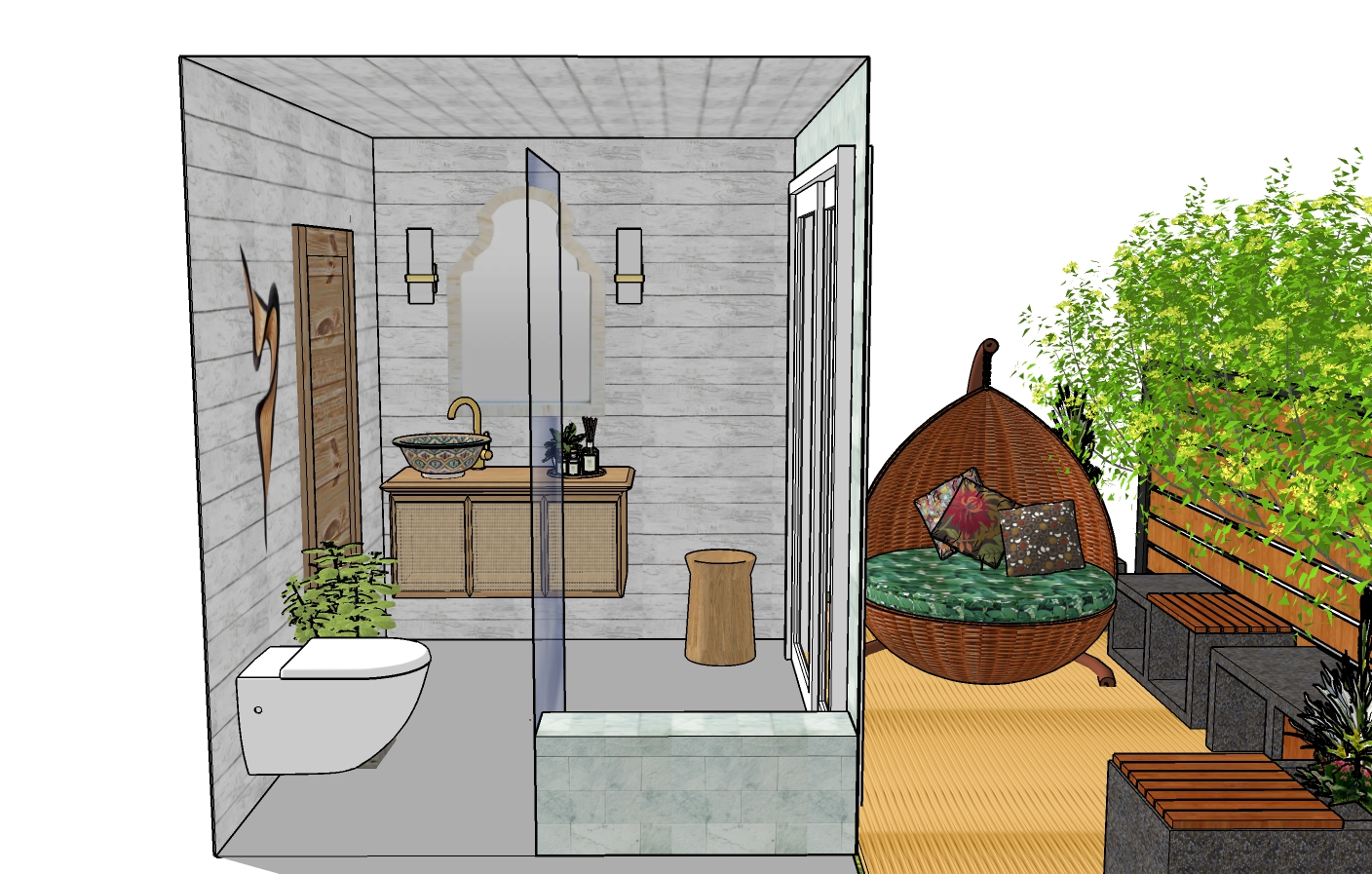 - Likes VJ paneling; stone/natural tiles; Moroccan-style tiles