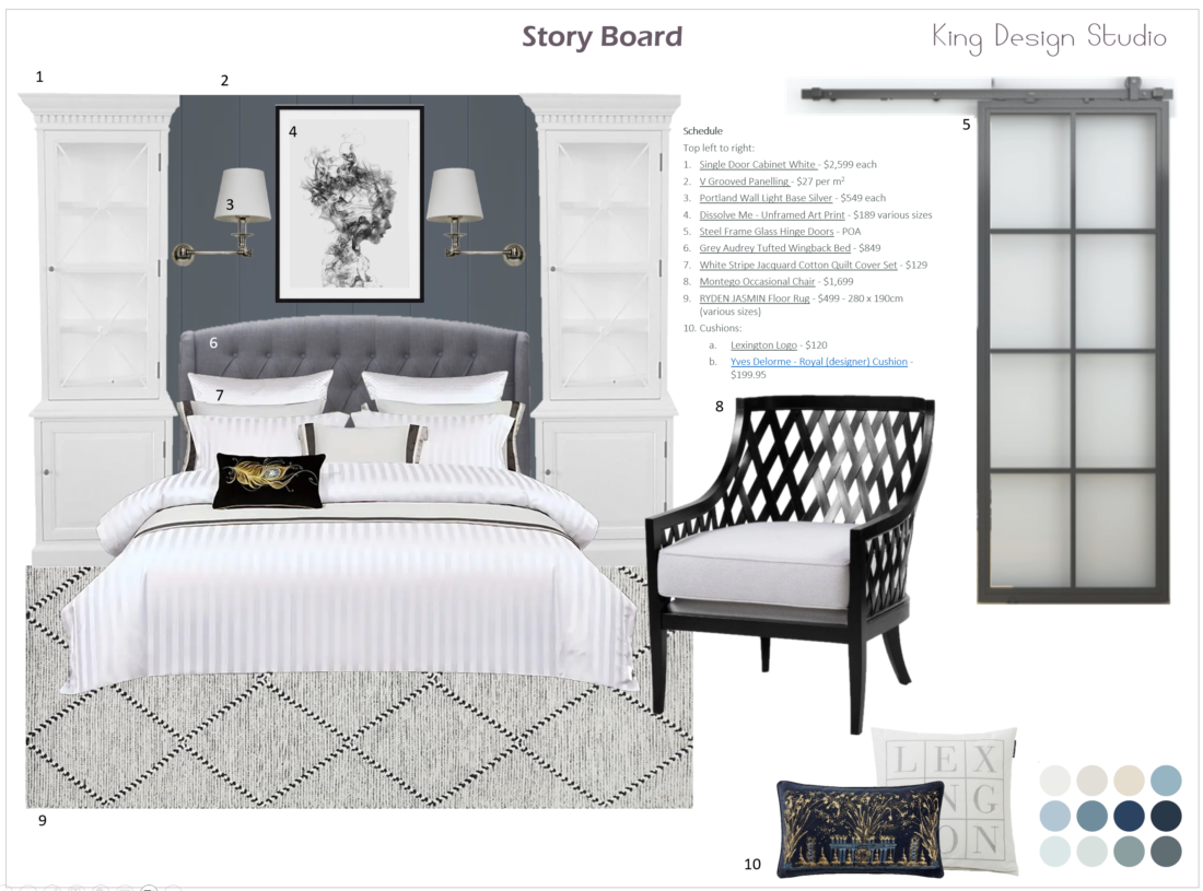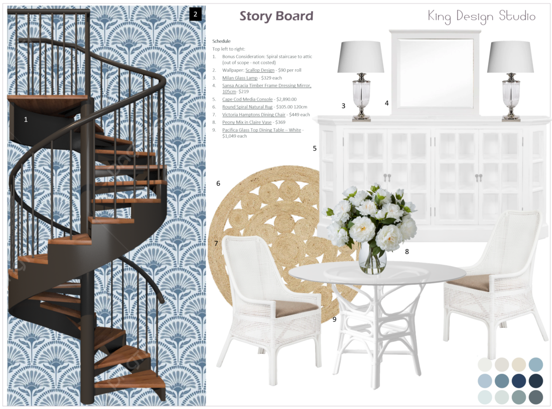 The client has indicated an affinity with modern Hamptons style; white and blue-hues with perhaps touches of mint; greys/ natural tones. She provided some inspirational photos, which have been taken into consideration in final design choices. Some inspirational photos indicate an affinity with dramatic contrasting colours and chinoiserie wallpapers.